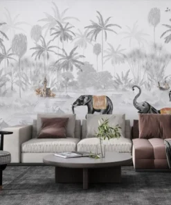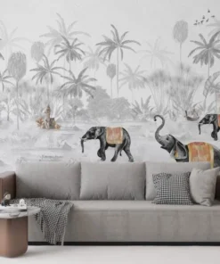 Crafted with attention to detail, this stunning mural features lifelike elephants surrounded by lush foliage. The gray tones not only enhance the mural’s sophistication but also ensure it harmonizes beautifully with various decor styles.
